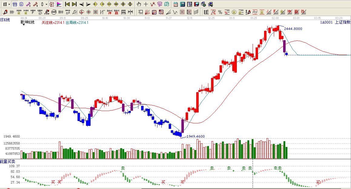 ☆依據(jù)贏家乾坤K線提示:大盤有紫色線轉換為藍色線,跌破關注線,看空做空。