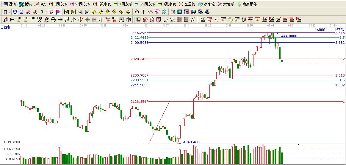 ☆依據(jù)贏家黃金價格延伸線提示:大盤如期跌至黃金分割延伸線2倍位置,短期構成壓力,這里不過看低一線至1.618位置2255附近.