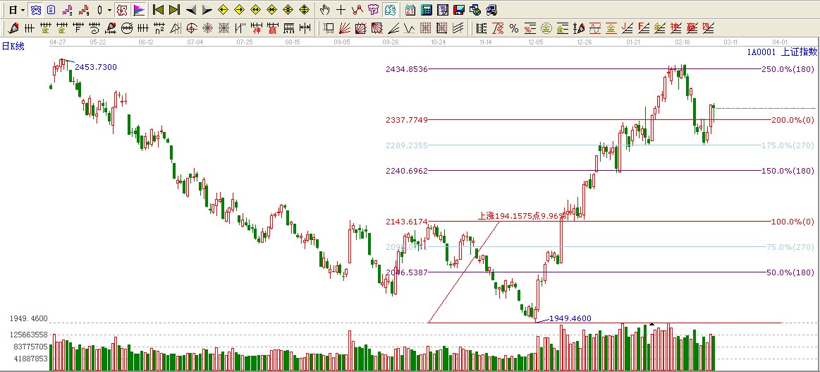 ★依據(jù)贏家波段百分比延伸線提示:目前大盤處于波段百分比延伸線200%(0)度位置2337點此位置不破看高至250%(180)度位置2434點附近。