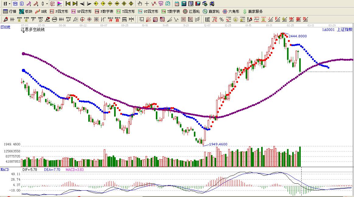 ★依據(jù)贏家江恩多空戰(zhàn)線提示:目前大盤運行在長期紫色多空線附近,短期藍色線上方,謹慎做多。