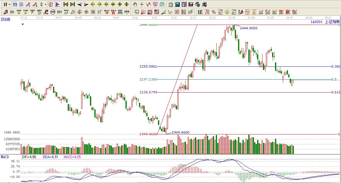綜上所述:大盤處于低點1949.46點至高點2444.80點回調0.5黃金分割位置,只有上行至0.5位置上方才會觸摸0.382位置2255.58點。否則還是震蕩下行為主。