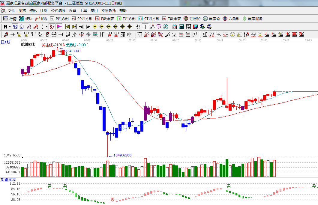 ★依據(jù)贏家江恩系統(tǒng)乾坤K線提示:出局線、關注線保持其頭并進,策略上以持股為主;(1)
