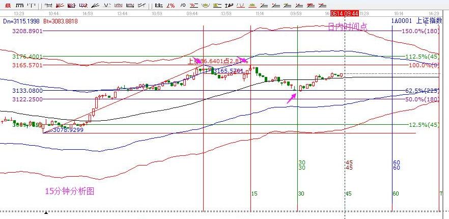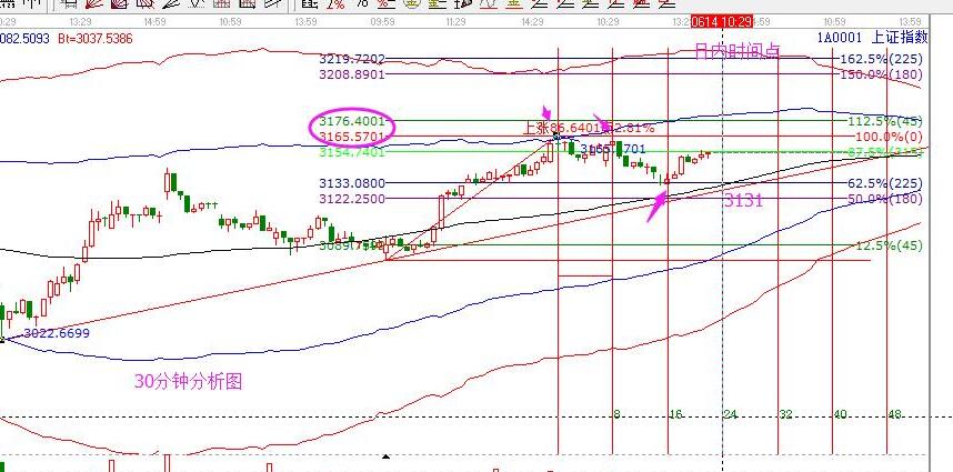 昨日分析及走勢(shì):昨日早盤分析中,給出的支撐是3120,壓力是3155點(diǎn),日內(nèi)時(shí)間10點(diǎn)。實(shí)際走勢(shì)為:最高3155點(diǎn),一點(diǎn)不差,日內(nèi)時(shí)間10點(diǎn)在3131止跌起漲,沒有完全回踩到預(yù)期的支撐,但時(shí)間為先,對(duì)照下方15分鐘圖和30分鐘圖,可以清晰的看到昨天市場(chǎng)的運(yùn)行軌跡。以前分享過這個(gè)經(jīng)驗(yàn),再說(shuō)明一次:以兩個(gè)高點(diǎn)做等距周期,按照經(jīng)驗(yàn)對(duì)應(yīng)的下個(gè)時(shí)間見低點(diǎn)概率大,昨天的走勢(shì)再次驗(yàn)證了此成功率。15分鐘和30分鐘小雙頭預(yù)測(cè)了昨天的低點(diǎn)時(shí)間,大盤個(gè)股都通用,有心的朋友可以結(jié)合自己的股票試試奧。大盤生命線附近震蕩?kù)柟?,僅作短線回調(diào)對(duì)待,3016和3022雙針引發(fā)的上漲遠(yuǎn)未結(jié)束,所以按照自己的策略執(zhí)行交易即可。