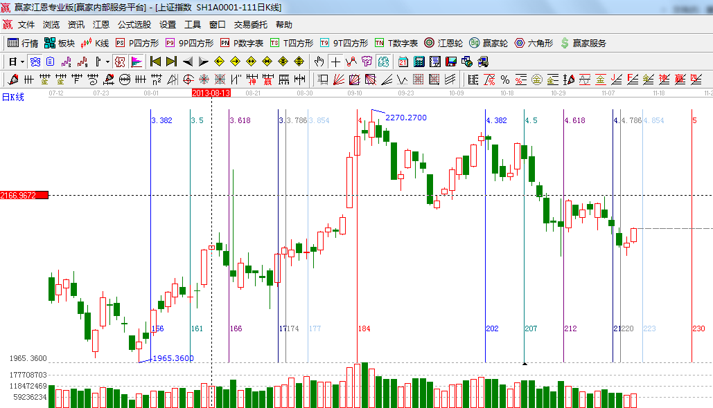★依據(jù)贏家江恩系統(tǒng)波段百分比延伸提示:黃金分割價格圖0.5位置是2090,0.382位置是2049;
