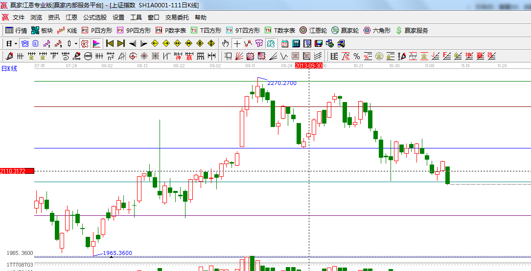 ★依據(jù)贏家江恩系統(tǒng)波段百分比延伸提示:黃金分割價(jià)格圖0.5位置是2090,0.382位置是2049;