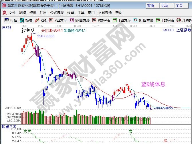 ☆依據(jù)贏家江恩理論系統(tǒng)乾坤K線提示:藍色K線代表波段休息,收盤價在短期出局線下運行,短線、波段看空。