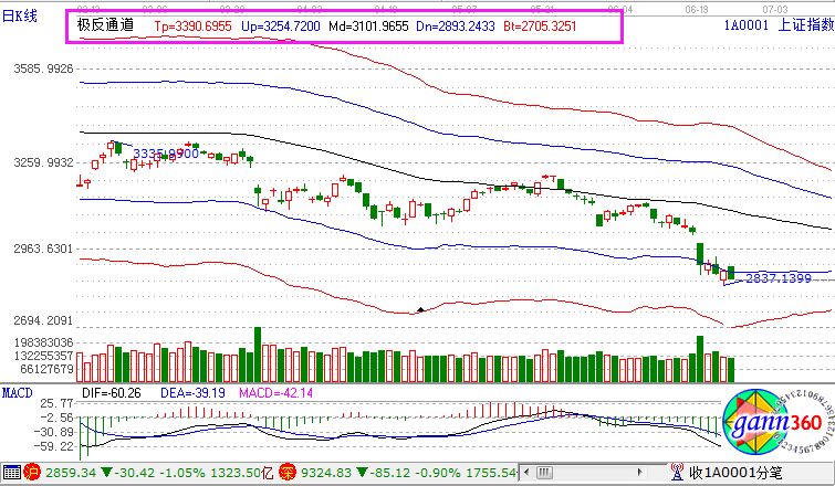 滬指跌1.05%,報(bào)收2859點(diǎn);深成指跌0.90%,報(bào)收9324點(diǎn);創(chuàng)業(yè)板跌0.72%,報(bào)收1538點(diǎn)。從盤(pán)面上看,石油采掘、白酒、債轉(zhuǎn)股、鈦白粉、農(nóng)業(yè)、次新股、上海國(guó)資改革等板塊漲幅居前;機(jī)場(chǎng)航運(yùn)、鋼鐵、煤炭、銀行、租售同權(quán)、豬肉、造紙等板塊跌幅居前。滬股通凈流出23億,深股通凈流出12億。相應(yīng)的極反通道指標(biāo)的支撐壓力提示,如下圖所示: