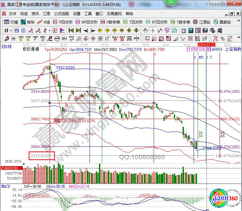 ☆依據贏家江恩理論系統(tǒng)波段百分比延伸線提示:日線跌穿180度2800點,按照規(guī)則看低一線至240度2713附近。