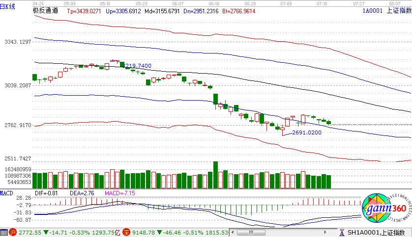滬指跌0.53%,報收2772點(diǎn);深成指跌0.51%,報收9148點(diǎn);創(chuàng)業(yè)板跌1.11%,報收1590點(diǎn)。從板塊漲幅上看,鋼鐵、高送轉(zhuǎn)、水泥、尾氣治理等少數(shù)上漲;農(nóng)業(yè)、機(jī)場航運(yùn)、在線旅游、海南、黃金等板塊跌幅居前。滬股通凈流入18億,深股通凈流入8.7億。相應(yīng)的極反通道指標(biāo)的支撐壓力提示,如下圖所示: