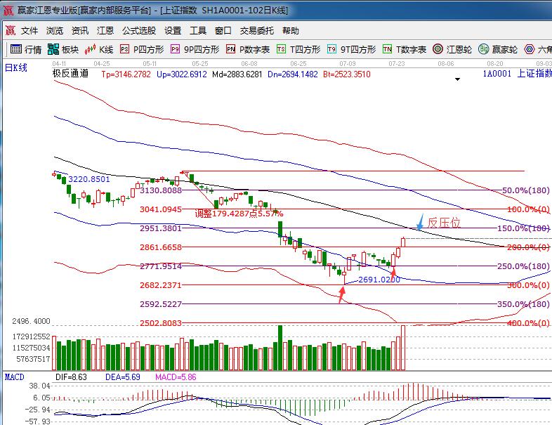 ☆依據(jù)贏家江恩理論系統(tǒng)極反通道提示:滬指日線向黑色生命線2950附近邁進,短周期15、30分鐘在藍色上軌線震蕩走高,帶動60分鐘向上軌線靠近,按周期關系推導,15、60分鐘共振原理,2929藍色上軌線預計將形成拐點。按規(guī)則15分鐘進入強勢區(qū)具備操作條件,又因日線處于弱勢,短線謹慎看多,中線看空。