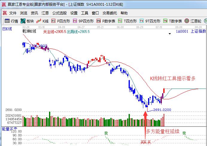 ★依據(jù)贏家江恩理論系統(tǒng)乾坤K線提示:20、23號藍色K線顏色轉紫,今日紫K線轉為紅色,按工具規(guī)則紅K波段看多。