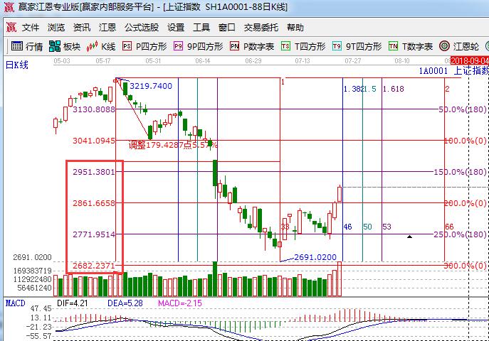 ★依據(jù)贏家江恩理論系統(tǒng)波段百分比延伸線提示:以5月21號高點為起點,5月30號低點為終點做百分比延伸線如下圖,180度、零度對應的是2771點、2861點,2861零度位置不破,短線還有望向上2951靠近。