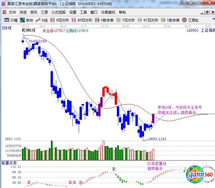 ★依據(jù)贏家江恩理論系統(tǒng)乾坤K線提示:K線顏色由藍(lán)變紫,為波段關(guān)注信號;股價(jià)突破關(guān)注線,短線、波段看多。