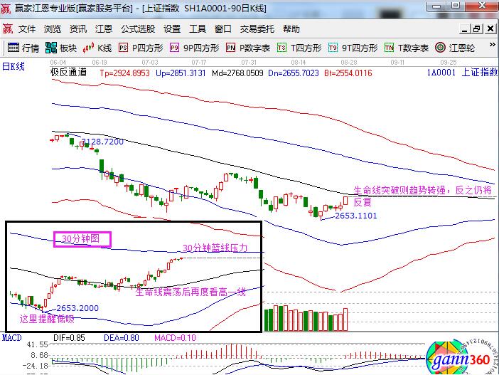 ☆依據(jù)贏家江恩理論系統(tǒng)極反通道提示:日線逼近極反通道生命線壓力,繼續(xù)突破則趨勢轉(zhuǎn)強(qiáng)打開新空間,反之將震蕩反復(fù)。在未有效突破站穩(wěn)前,短線保持謹(jǐn)慎。日內(nèi)周期30分鐘下方藍(lán)線是本次反彈提醒的進(jìn)場點(diǎn),按照規(guī)則一線站穩(wěn)看高一線,在生命線附近震蕩后,再次看高到藍(lán)色上軌線,當(dāng)前股價(jià)面臨藍(lán)線2795點(diǎn)的壓力,不能強(qiáng)勢突破,短線防回落。周二重點(diǎn)關(guān)注2800一線,不能強(qiáng)勢收復(fù),短線逢高兌現(xiàn)為主,站上確認(rèn)走強(qiáng)再買回。