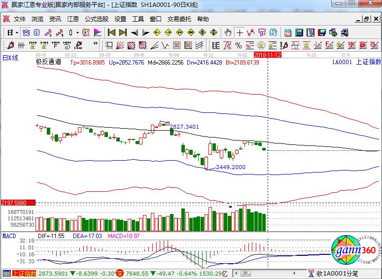 滬指跌1.39%,報(bào)收2598點(diǎn);深成指跌0.64%,報(bào)收7648點(diǎn);創(chuàng)業(yè)板跌0.51%,報(bào)收1322點(diǎn)。從盤(pán)面上看,創(chuàng)投、造紙、5G、電子發(fā)票、數(shù)字中國(guó)、ST板塊等板塊領(lǐng)漲;銀行、黃金、海南、油改、有色、機(jī)場(chǎng)航運(yùn)等板塊領(lǐng)跌。滬股通凈流入8000萬(wàn),深股通凈流入3億。相應(yīng)的極反通道指標(biāo)的支撐壓力提示,如下圖所示: