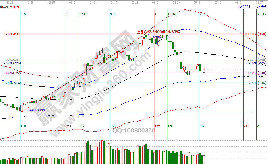 5月10號、20號,大盤日K線分別回探波段百分比延伸線1倍循環(huán)二分位2834點后止跌企穩(wěn),第一次反彈止步于短周期60分鐘生命線位置,本次關注此線能否突破站穩(wěn)(學員通過工具查看關鍵位),站上此線則指數日k線回補下方缺口的概率將降低(但不排除),23號短周期時間后會再次進行評估。投資者應好好把握當前機會,待整固結束后市場必會有一波反彈到生命線的機會。本周短周期重要時間窗口是23號,日線時間窗口是28(29)號。22號盤中壓力是180度2928點、225度2944點,盤中支撐是90度2894。操作策略,指數擊破黑色生命線進入弱勢區(qū)域,高風險者倉3-5成,低風險者本周進入備戰(zhàn)期擇機參與。