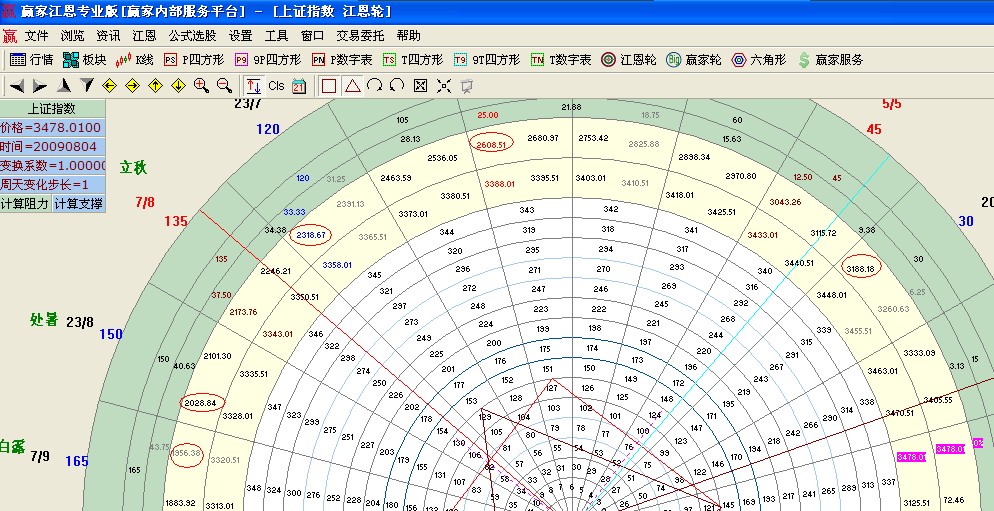 用鼠標(biāo)點擊3478點,屏幕上方會有一個小三角說明我們選中該點位,然后鼠標(biāo)點擊工具欄中江恩輪圖形打開如下圖,變換系統(tǒng)使用默認(rèn)的1,周天變化步長默認(rèn)1,最后點擊計算支撐,我們發(fā)現(xiàn)歷史上重要的點位如3186、2610、2319等點位都在輪子上面得到提現(xiàn),3186是30度位置、2610是90度位置,2319為120度,依此來推算當(dāng)下大盤支撐是150度的2028點,此點位與江恩箱,黃金分割、極反通道等分析工具得出點位基本一至,需要投資者重點關(guān)注此區(qū)域得失。