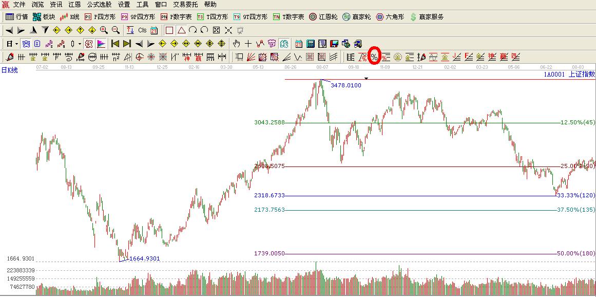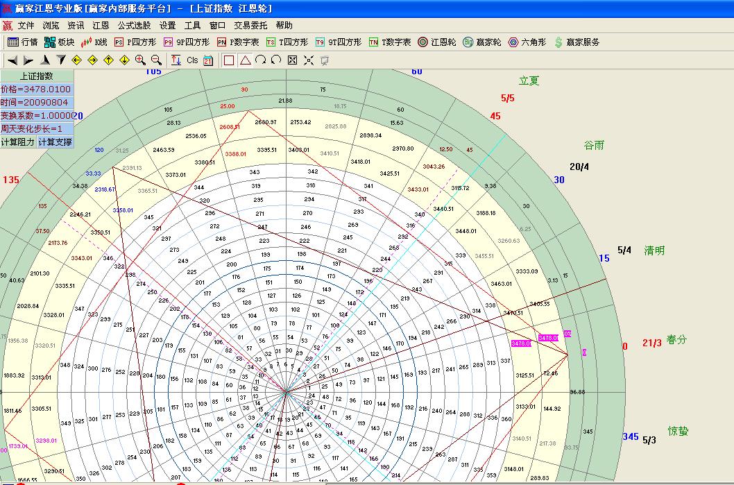 咨詢:13333833889輪中輪在江恩理論中可以說(shuō)占據(jù)者舉足輕重的地位,其重要的點(diǎn)位往往會(huì)發(fā)生重要的轉(zhuǎn)折,而江恩價(jià)格百分比跟輪中輪有著較為密切的關(guān)系,他們之間有著什么樣的關(guān)系,輪中輪的點(diǎn)位是如何計(jì)算出來(lái)的?我們以大盤(pán)2009-08-04日3478.01點(diǎn)為高點(diǎn)來(lái)解說(shuō)輪中輪跟江恩價(jià)格百分比的共同之處跟計(jì)算方法: