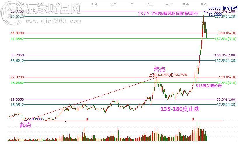 圖形解析:振華科技,以2018年10月16日低點到2020年2月26日高點這波上漲為起始因子,通過對波段內(nèi)的運行結(jié)構(gòu)分析,保留135度,180度,及315度關(guān)鍵分割位,可以看到市場啟動之后,其階段高點出現(xiàn)在237.5-250%循環(huán)區(qū)間。
