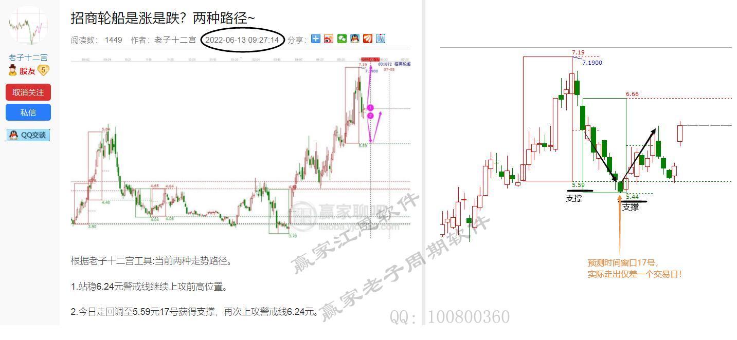 招商輪船6月13號依據(jù)十二宮時空工具預(yù)測未來趨勢,預(yù)判未來時間窗口17號變盤,價格趨勢給出兩種路徑,第一種直接獲得警戒線支撐上漲頂部7.19元目標(biāo)位。第二種跌破警戒線回調(diào)結(jié)構(gòu)底部5.59元位置到17號再次上攻警戒線6.24元位置。