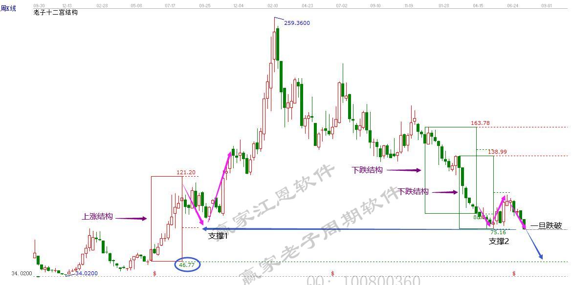 2.當(dāng)下跌結(jié)構(gòu)形成之后,重點(diǎn)要注意下跌結(jié)構(gòu)的底部能否獲得支撐。一旦破位,按照規(guī)則標(biāo)準(zhǔn),持續(xù)下跌或創(chuàng)新低。接著再次出現(xiàn)下跌結(jié)構(gòu),底部獲得前方上漲結(jié)構(gòu)警戒線支撐和當(dāng)前底部支撐,視為反彈警戒線趨勢(shì)。然后未能突破,就會(huì)必然繼續(xù)尋找底部75.16元。