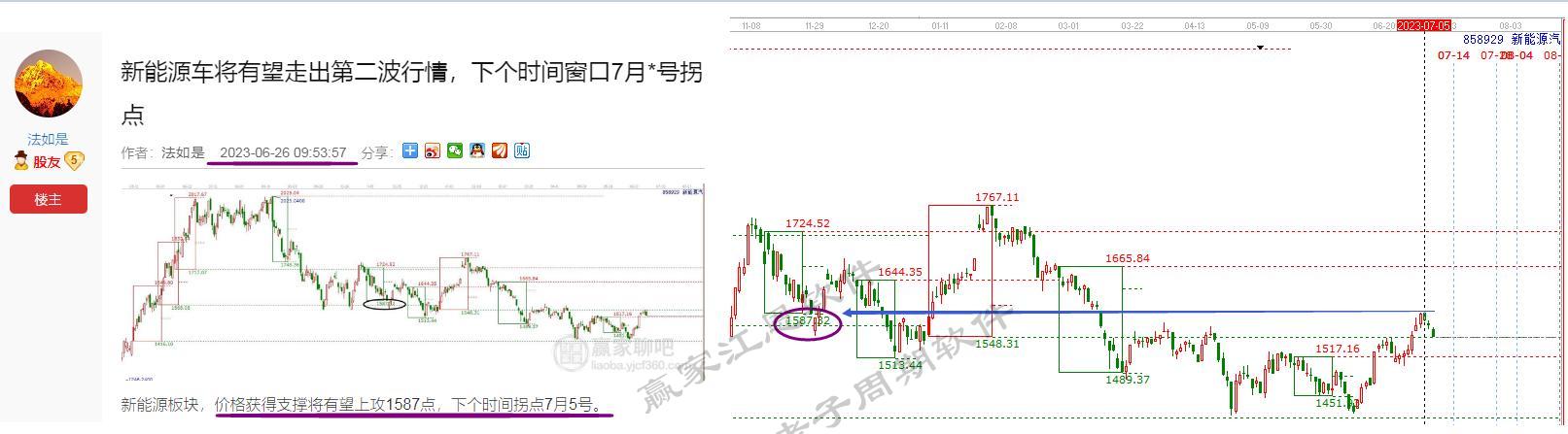 案例一:新能源汽車指數(shù)于6月26日運(yùn)用江恩時(shí)空技術(shù)解析:空間上獲得支撐位1517點(diǎn),有望上攻1587點(diǎn),時(shí)間上轉(zhuǎn)折點(diǎn)為7月5號(hào)。