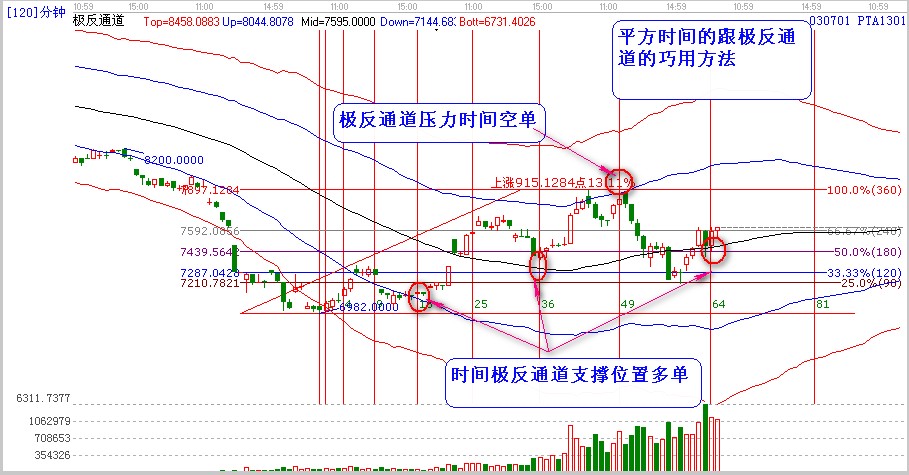 我們?cè)趤砜磒ta日線級(jí)別的一個(gè)位置,pta見底以來運(yùn)行的時(shí)間周期平方時(shí)間,在每次的高點(diǎn)點(diǎn)演繹了重要的位置,明天就是pta的低點(diǎn)來的36天【6*6平方時(shí)間】處于極反通道生命線附近。