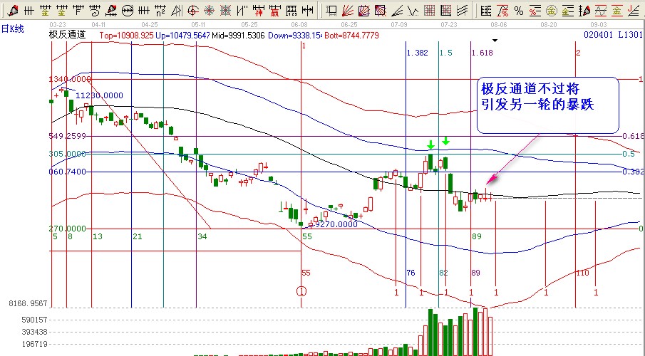 時間我們根據(jù)贏家的k線時間四方形點擊2012.6月8日的地點,設(shè)置步長為7對其展開的時間分割,可以看出在7.6日的一個短期下跌在7.13日的一個開始上攻,在7.20日的一個快速下跌,最近的7.27日大陽后的盤整,都起到了一個重要的作用,明日8.3日也是這個時間窗口,如果不能突破極反通道生命線的位置【9740】點有可能結(jié)束盤整引發(fā)新一輪的下跌。