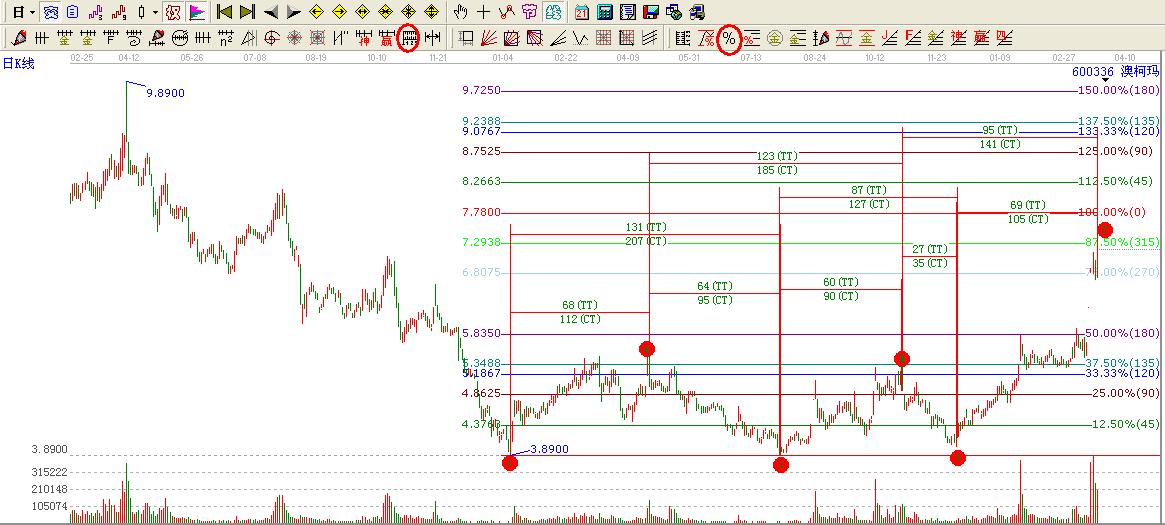 江恩理論之所以在金融界被稱作3大理論之一,是因為其很多東西久經(jīng)市場的考驗的,江恩是一套以時間為核心的理論, 對其金融市場進(jìn)行分析預(yù)測,其方法預(yù)測準(zhǔn)確性讓很多人癡迷,其實(shí)江恩的預(yù)測系統(tǒng)跟交易系統(tǒng)是完全獨(dú)立的2個系統(tǒng),在預(yù)測出現(xiàn)失誤的時候,會靠其嚴(yán)格的規(guī)則執(zhí)行紀(jì)律:例如規(guī)則2 在單底、雙底和三重底買入。今天我們就以600336 澳柯瑪對其解讀如圖所示: