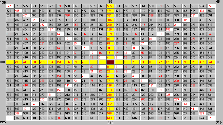 咨詢(xún):13333833889| 下圖為著名的江恩測(cè)市工具-江恩螺旋四方形,也叫江恩正方形 |