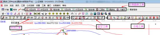 1.軟件安裝成功之后,第一次打開軟件,可以看到K線界面,此時(shí),可以按鍵盤上的F2 F3,調(diào)出完整的工具欄: