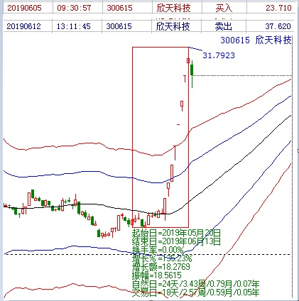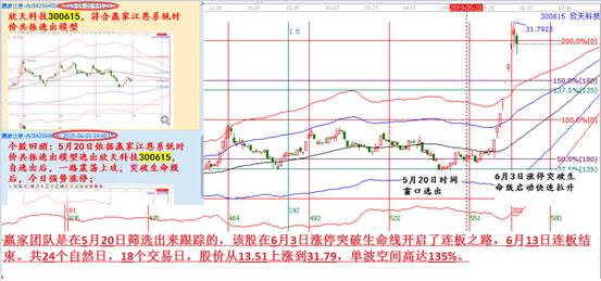接下來(lái)介紹下近期的牛股欣天科技(300615),這是一個(gè)翻倍股,贏家團(tuán)隊(duì)是在5月20日篩選出來(lái)跟蹤的,該股在6月3日漲停突破生命線(xiàn)開(kāi)啟了連板之路,6月13日連板結(jié)束。共24個(gè)自然日,18個(gè)交易日,股價(jià)從13.51上漲到31.79,單波空間高達(dá)135%。