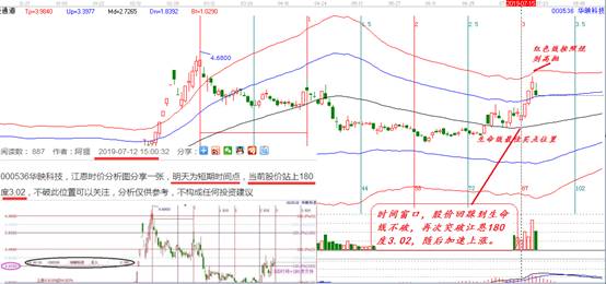 趨勢:股價處于生命線上,強勢區(qū)可操作;價格:江恩180都價格支撐點3.02,生命線支撐2.72,;時間:7月15日。具體分析及圖形可參考下圖: