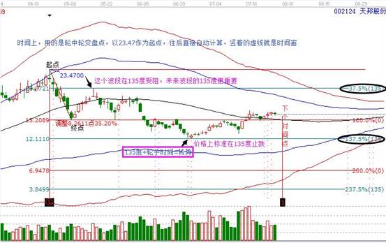 以5月20日的低點(diǎn)和6月20日的高點(diǎn)為起始點(diǎn),選擇這波上漲空間為波動(dòng)因子,同時(shí)結(jié)合市場(chǎng)走勢(shì)保留了江恩45度分割比率,圖形如下: