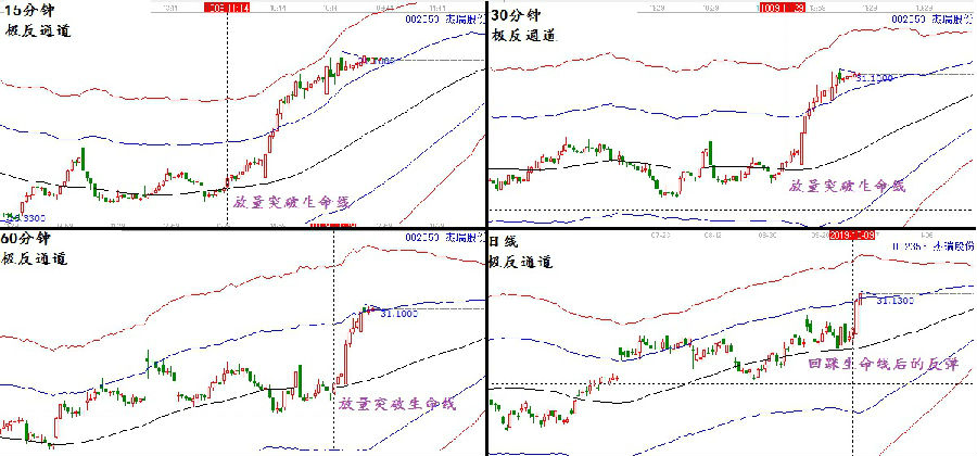 趨勢(shì)共振模型一類:以極反通道生命線為判斷依據(jù),生命線是判斷市場(chǎng)趨勢(shì)強(qiáng)弱的分界線,可以快速直觀的判斷出市場(chǎng)短期,中期,及長(zhǎng)期的趨勢(shì)強(qiáng)弱,如果各周期都是處于強(qiáng)勢(shì)區(qū),這就是一種共振。因此,在實(shí)戰(zhàn)交易中,投資者關(guān)注周線,日線,60分鐘,30分鐘,及15分鐘,如果這幾個(gè)周期都是處于生命線附近,走勢(shì)協(xié)同,就會(huì)出現(xiàn)短期的快速拉升走勢(shì)。