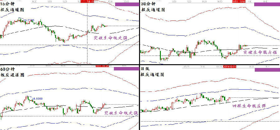 從圖中可以看到10月9日股價(jià)的走勢(shì),其中15分鐘,30分鐘,60分鐘都是放量突破生命線,而日線是處于生命線回踩后的反彈階段,其周線圖中我沒有展示,因?yàn)橹芫€是處于江恩240度關(guān)鍵支撐點(diǎn),并沒有在生命線附近。