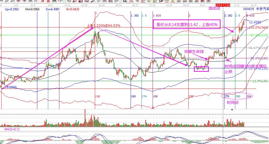 長(zhǎng)安汽車(chē),是在2019年12月4日選出,理由是:股價(jià)處于生命線(xiàn)上強(qiáng)勢(shì)區(qū)域,價(jià)格在江恩180度重要支撐附近,12月6日為時(shí)間窗口。同時(shí),市場(chǎng)整體處于非下跌周期中。股價(jià)在時(shí)間窗口回撤江恩180度及生命線(xiàn)支撐,構(gòu)成了最佳買(mǎi)點(diǎn),12月11日股價(jià)突破240度阻力,向上打開(kāi)新的空間,市場(chǎng)沿著藍(lán)色線(xiàn)向上運(yùn)行,目前已經(jīng)運(yùn)行到紅色線(xiàn)附近,從選出到今天,按照規(guī)則操作持股,這波的盈利空間超過(guò)40%。