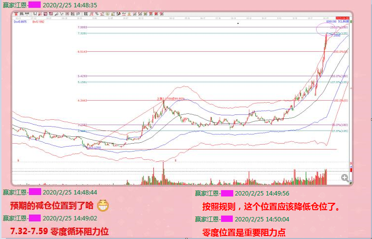 下圖是TCL科技在2月6日的技術(shù)分析圖形,具體的作圖方法是,以2018年10月19日的低點和2019年3月25日的高點為起始點,作出江恩波段百分比延伸線(江恩經(jīng)典價格循環(huán)分析工具之一),保留120度和180度分割(后期調(diào)整為135度和180度,更契合市場的歷史走勢)。從圖中可以看到,股價在從最低點2.17起漲后,紅色線見頂回落,并最終在江恩波段百分比120度與180度空間完成止跌,這個分割位是我們在實戰(zhàn)運用中頻繁強(qiáng)調(diào)的調(diào)整位。止跌之后震蕩上行,并在2019年12月17日突破站上了100%的零度位,此為前期高點,股價在突破后,進(jìn)入到了新的空間,即100%到133.3%-150%分割區(qū)間,價格波動空間為4.34-5.42。2月6日股價放量上攻,突破了5.06直接挑戰(zhàn)5.42,此時我們要關(guān)注的是,該循環(huán)空間是否會打開,股價進(jìn)入新的空間。其關(guān)鍵點就是,價格突破5.42。此位置對應(yīng)了33.33%-50%區(qū)間。當(dāng)天最終股價放量漲停突破。