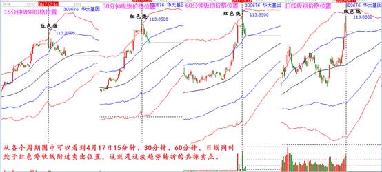確定了買點(diǎn),那么賣點(diǎn)在哪里呢?同樣的,按照極反通道的操作規(guī)則,一線站穩(wěn),看高一線。當(dāng)股價(jià)的15分鐘、30分鐘、60分鐘、日線等周期都處于藍(lán)色線,或者紅色外軌線這類高概率的賣出點(diǎn)時(shí),就意味著各個(gè)周期都處于賣出位置,這就是一個(gè)周期共振的賣點(diǎn)。我們?cè)倏聪氯A大基因4月17日各個(gè)周期所處的位置。