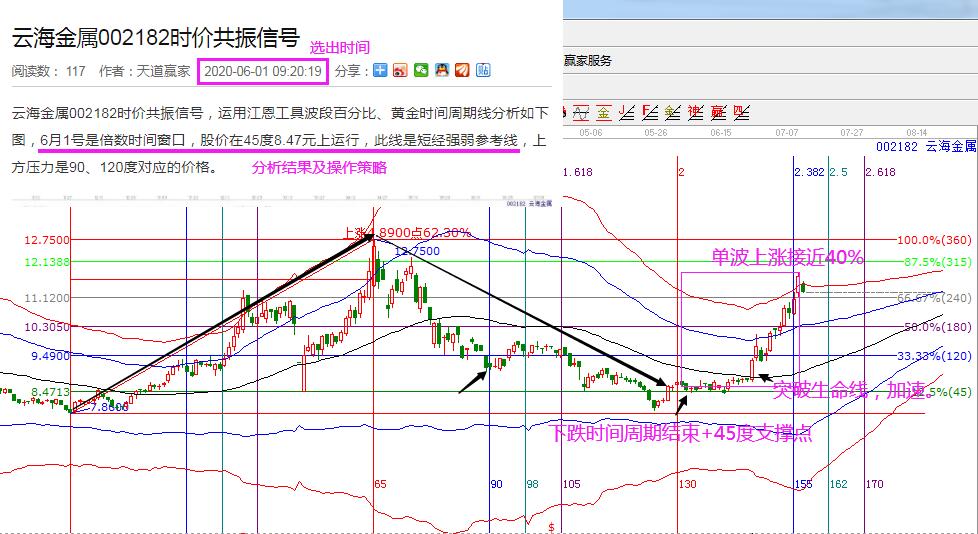 云海金屬:6月1日時間窗口選出,這天就是倍數(shù)時間窗口,市場的下跌周期結(jié)束,同時股價處于重要支撐點附近,符合時價共振規(guī)則。因而開始跟蹤,隨后股價在45度支撐上方震蕩,并在6月23日突破生命線進入強勢區(qū),隨后開始加速上漲,截止周五收盤,股價上漲到紅色線附近。從選出單波上漲的幅度接近40%。若從突破生命線的右側(cè)信號算起,接近35%。這就是一個經(jīng)典的左側(cè)買入操作案例。