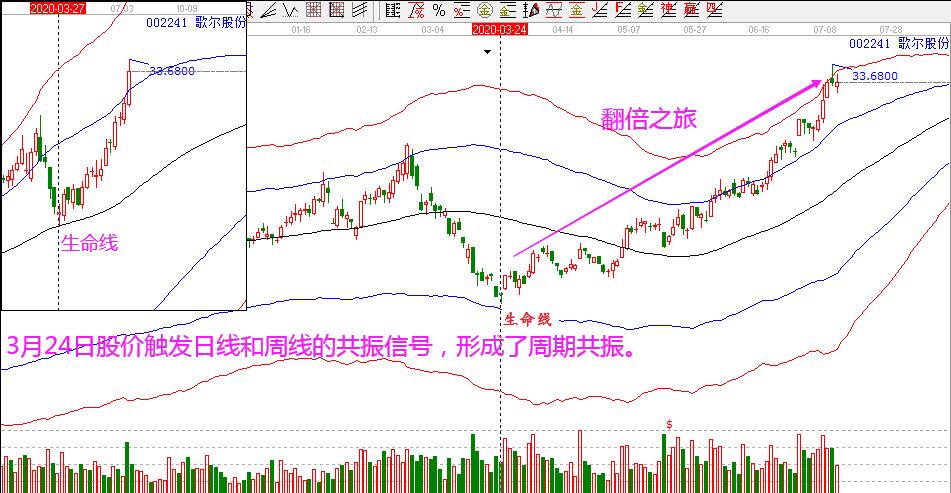璞泰來和歌爾股份:這兩個票都是在3月底關(guān)注的,隨著大盤的一波下跌,不少績優(yōu)股也給出了更好的位置,其中,璞泰來在3月23日股價日線下跌至藍色下軌線附近,同時周線回踩到生命線,形成了超跌+最佳的周期共振信號;歌爾股份在3月24日股價下跌至藍色下軌線附近,同時周線回踩到生命線,同樣形成了超跌+最佳的周期共振信號。這兩個股票隨后都是展開了翻倍的行情,也都是非常經(jīng)典的周期共振的左側(cè)交易買入案例。