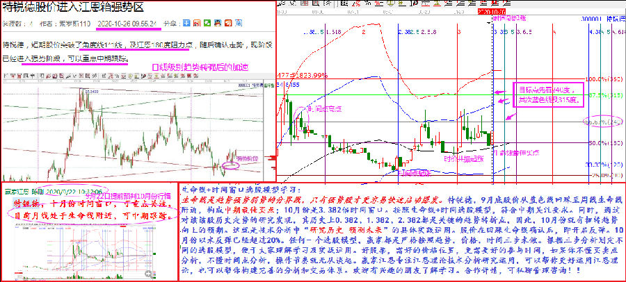生命線是趨勢強勢弱勢的分界線,只有強勢股才更容易快速啟動爆發(fā)。特銳德,9月底股價從藍色線回踩至周線生命線附近,構(gòu)成中期最佳買點;10月份是3.382倍時間窗口。按照生命線+時間選股模型,符合中期關(guān)注要求。同時,通過對該該股歷史走勢的研究發(fā)現(xiàn),其歷史上0.382、1.382、2.382都是關(guān)鍵的趨勢轉(zhuǎn)折點,因此,10月份就有扭轉(zhuǎn)趨勢向上的預(yù)期。這就是技術(shù)分析中“研究歷史 預(yù)測未來”的具體實踐運用。股價在回踩生命線確認后,即開啟反彈。10月份以來反彈已經(jīng)超過20%。任何一個選股模型,贏家都是嚴格按照趨勢,價格,時間三步來做。根據(jù)三步分析劃定不同的選股模型,便于大家理解學(xué)習(xí)及實戰(zhàn)運用。好股票,需好的價格位置,更需要好的參與時間,如果你不懂買賣點分析,不懂時間點分析,操作節(jié)奏就無從談起。贏家江恩專注江恩理論技術(shù)分析研究運用,可以幫你更好運用江恩理論,也可以幫你構(gòu)建完善的分析和交易體系。