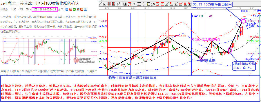 時間決定趨勢,趨勢決定價格,價格決定買賣。從選股到買賣點的確定,時間因素都是起著決定的作用。當(dāng)時間與價格形成四方市場轉(zhuǎn)勢便迫在眉睫??臻g上,五礦稀土見高點后,11月2日回落至120度附近止跌反彈,11月24日上攻到紅色線與315度共振阻力點見高點,隨后回落至生命線與180度附近止跌。12月31日突破生命線,1月4日為2倍時間窗口到達,與生命線支撐形成共振,轉(zhuǎn)勢向上。股價震蕩攀升連續(xù)突破315度關(guān)鍵點及藍(lán)色線后到達133.33-150.0%重要價格循環(huán)位。股價單波上漲超過50%。在整個上漲階段,贏家聊吧都做有實時的分析跟進,幫助大家更好學(xué)習(xí)分析思路?,F(xiàn)在復(fù)盤來看,你能看懂這個上漲階段的操作機會嗎?