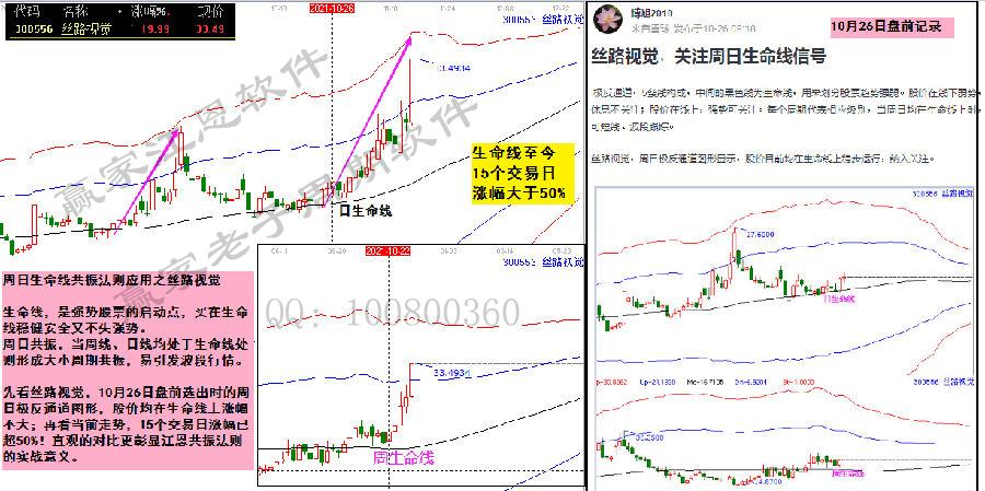 先看絲路視覺,10月26日盤前選出時(shí)的周日極反通道圖形,股價(jià)均在生命線上漲幅不大;再看當(dāng)前走勢(shì),15個(gè)交易日漲幅已超50%!直觀的對(duì)比更彰顯江恩共振法則的實(shí)戰(zhàn)意義。