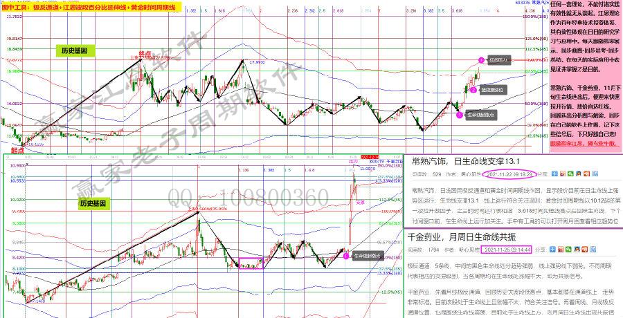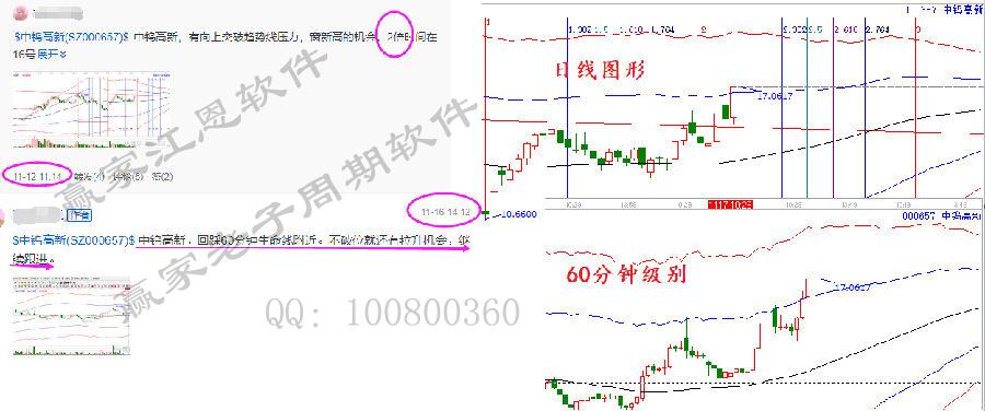 中鎢高新,里邊運用到了一個經(jīng)常講的知識點,12號選出,15號攻擊藍色上軌線失敗回踩,按照之前講過的知識點,當個股上攻藍色上軌線回落,就要結(jié)合60分鐘生命線判斷是洗盤還是趨勢上攻結(jié)束。16號回踩60分鐘生命線位置,且也到了前面分析講的日線2倍時間變盤點。企穩(wěn)反轉(zhuǎn)拉升,今天漲停突破藍色上軌線,進入新的空間。一旦站穩(wěn)藍色上軌線,目標就是紅色上軌線。只要能看懂了,這一波的利潤就不會錯過。這就是江恩周期之間的關(guān)系的具體用法,大周期制約小周期,小周期引導大周期。