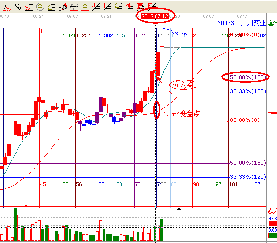 第二:依據(jù)贏家江恩分析系統(tǒng)時間工具,黃金時間周期線,提示此票7月12日,是黃金時間周期線的第二個循環(huán)的1.764的時間變盤點,(黃金時間周期線作圖,起點為2011年10月24日,終點2012年5月24日的連線)如下圖
