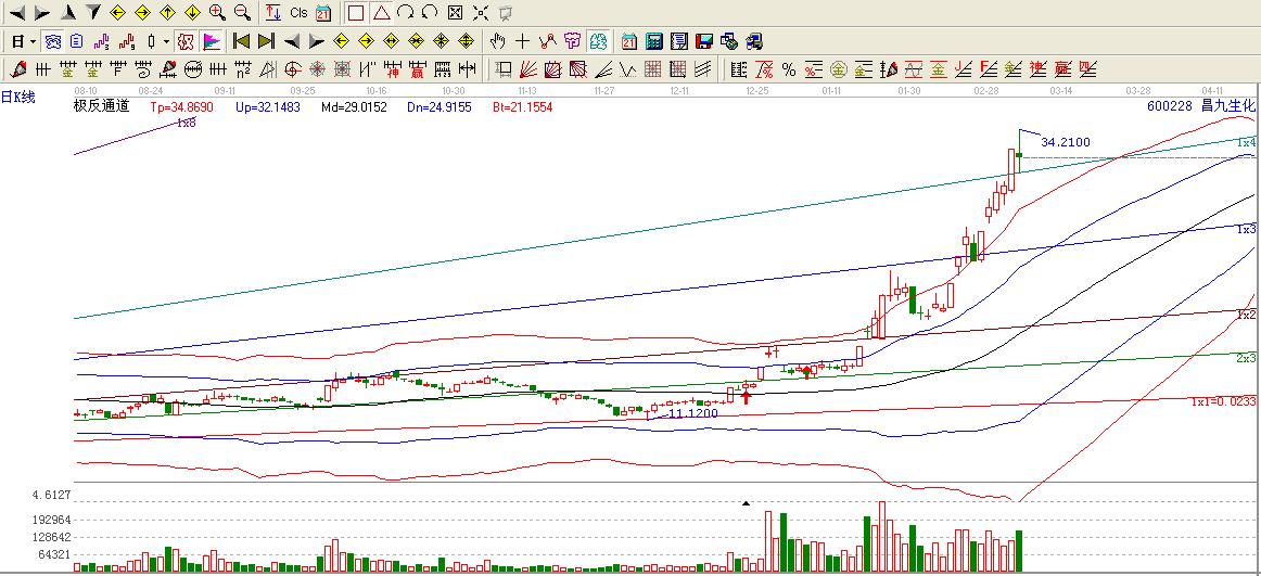 600228昌九生化在角度線1*1線位置2012-12-14日11.12止跌上行,連續(xù)的小陽線線 直到到2012-12-19日漲停極反通道上行才開始了黑馬之旅,底部構(gòu)成也可以算是10全10美。只有一跟小陰線,可以忽略不計(jì)。 一旦突破極反通道生命線,特別是漲停方式突破極反通道生命線,那就是短期進(jìn)入了強(qiáng)勢區(qū)域,贏家極反通道可以告訴我們:生命線上強(qiáng)勢走,生命線下難抬頭,牛股都是在生命線上方運(yùn)行的。每一次的運(yùn)動后期都是按照角度線運(yùn)行的,每一次的高點(diǎn)低點(diǎn)加倉位置都逃脫不了角度線的區(qū)域。