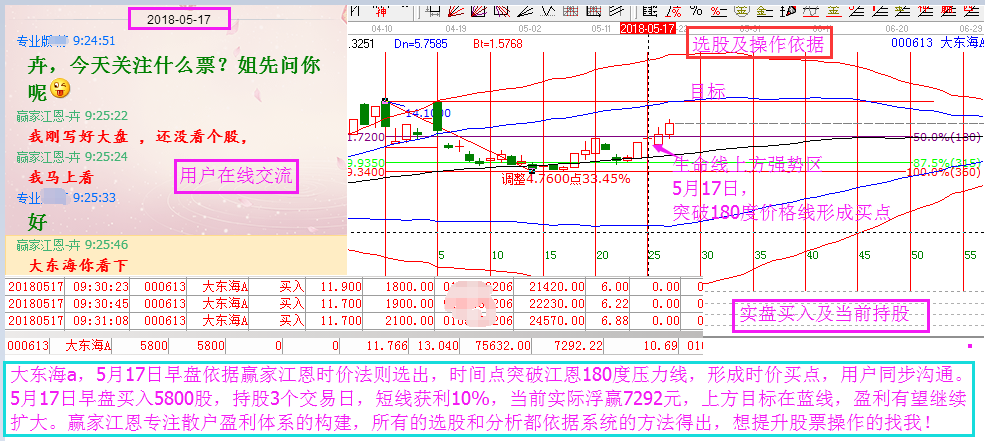 大東海a,5月17日依據(jù)贏家江恩時(shí)價(jià)法則選出,時(shí)間點(diǎn)突破江恩180度壓力線,形成買點(diǎn)。用戶按照規(guī)則同步操作,今天創(chuàng)出近期新高點(diǎn),漲幅超過15%。