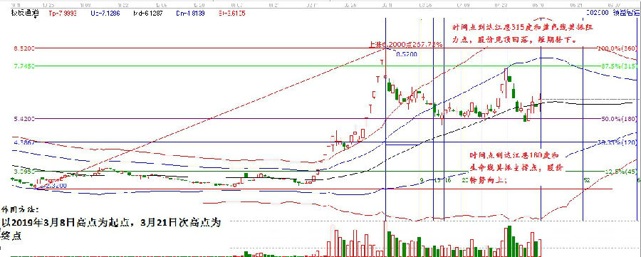 筆者將兩組時間圖形融合在一起,可以看到關鍵的啟動點2019年2月20日突破趨勢向上,開啟快速拉升行情;5月9日為兩組時間工具的共振時間點,股價從生命線拉起漲停,開啟新一輪的上漲。具體不再細說。