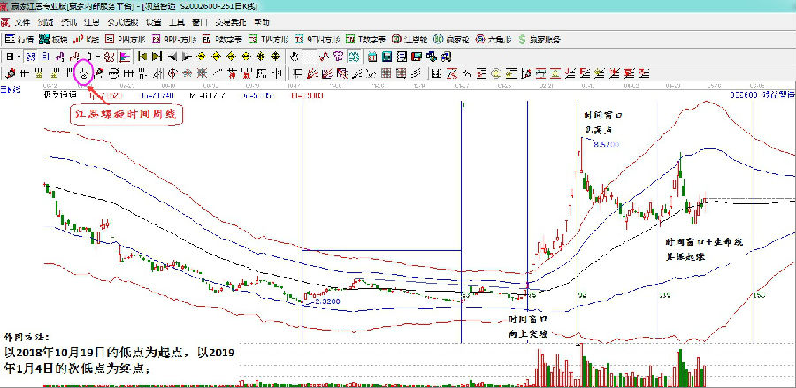 本周帶大家學習一個預判時間窗口的工具-江恩螺旋時間周期線。時間分析是有江恩首次引入到金融市場中,開啟了金融市場技術分析的新方向,江恩理論認為,時間是決定市場走勢的最重要因素,而經(jīng)過我們的長期實戰(zhàn),發(fā)現(xiàn)當時間和價格形成四方時,市場會發(fā)生趨勢的反轉,或出現(xiàn)大陰大陽的劇烈波動,同時伴隨著成交量的放大。我們進行時間分析,最重要的目的是判斷市場是處于上漲或下跌趨勢的什么階段,根據(jù)價格做好下一步走勢方向的預判。江恩螺旋時間周期線就是這樣的一個具備超強實戰(zhàn)意義的時間分析工具。接下來,筆者以兩個股票的具體走勢為例做個展示幫助大家了解該工具的具體應用。